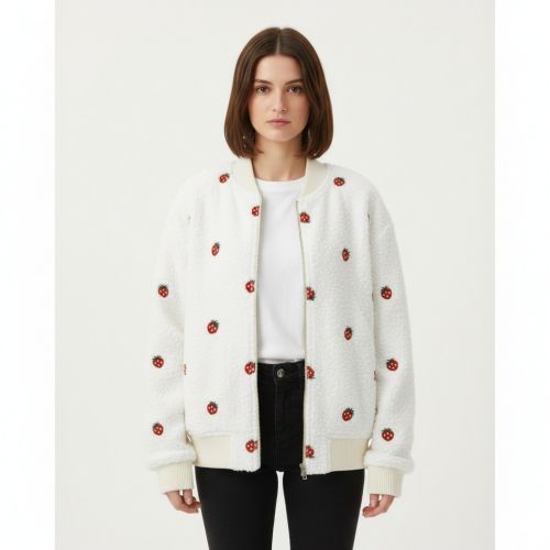 Coat fabric TEDDY EMBROIDERY Strawberries white