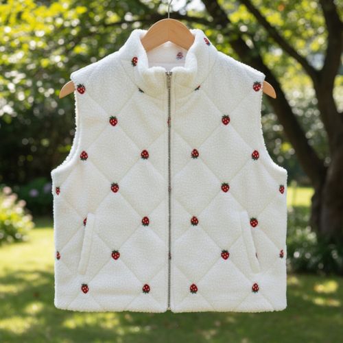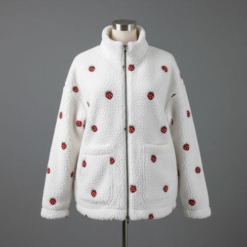 Coat fabric TEDDY EMBROIDERY Strawberries white