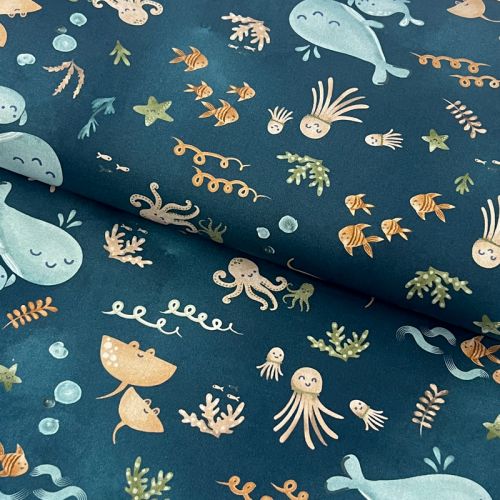 Cotton fabric Whales petrol digital print